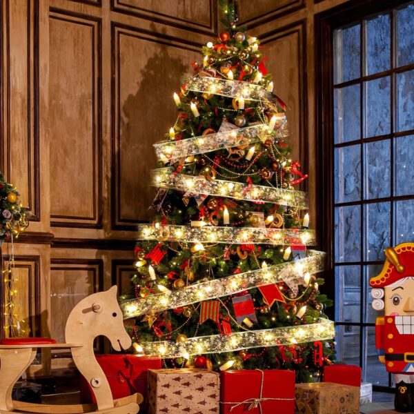 • Nowoczesny design: Dwustronnie tkaną złotą taśmę ozdobioną światłami LED, która wprowadza elegancki, świąteczny nastrój.