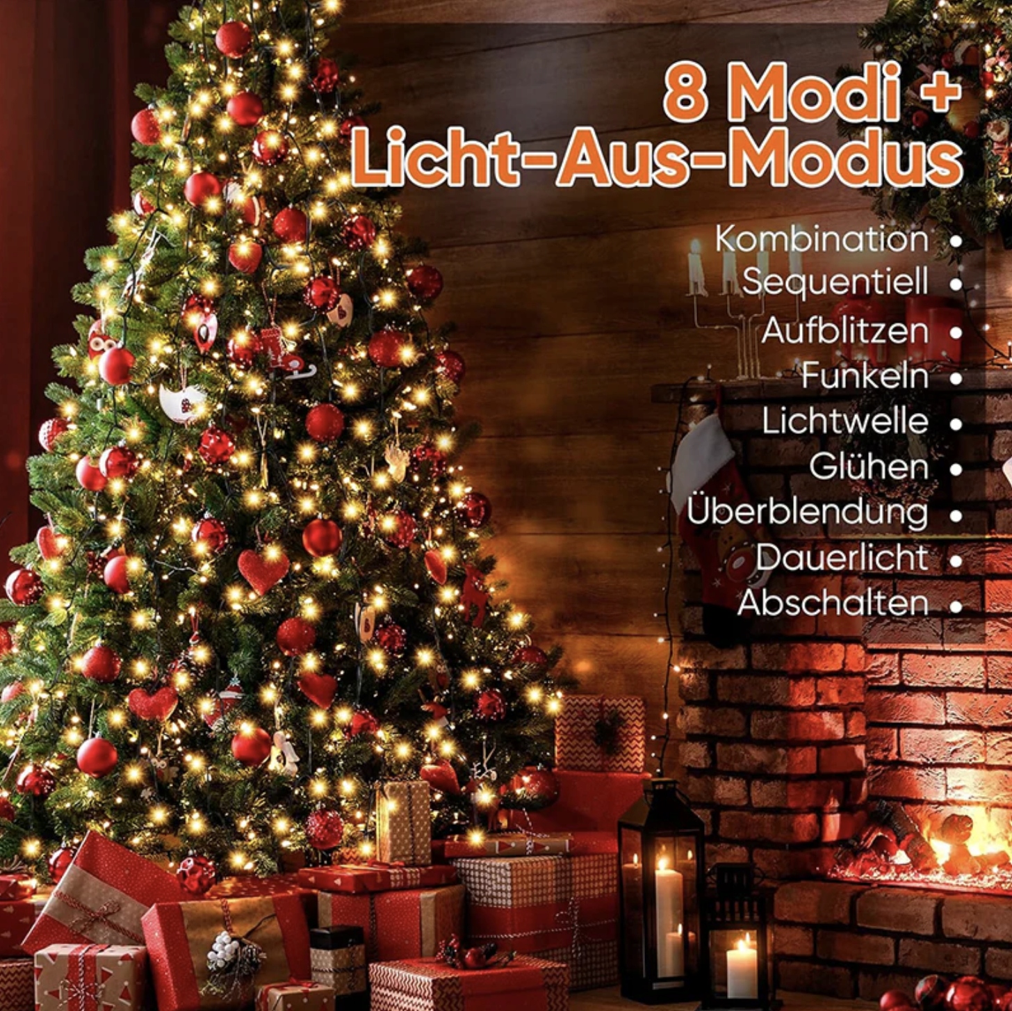 ✅ Lampki choinkowe LED z pierścieniem, 1,5 m x 10 pasm: Kabel zasilający 5 m, odległość świateł 6 cm; 10 zwisających ciemnozielonych kabli, 250 diod LED, 25 diod na kablu.