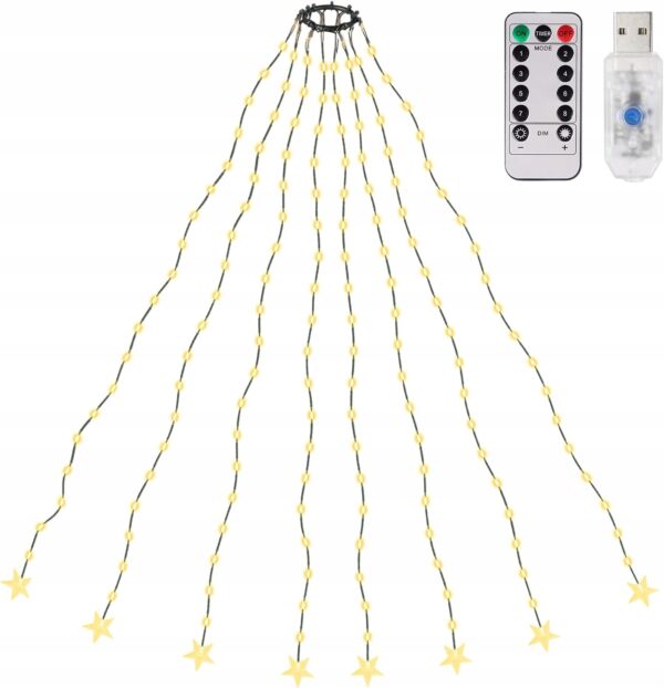 Lampki choinkowe z pierścieniem i gwiazdkami, 1,5m, 8 pasm, 120 diod LED, Ciepła biel
