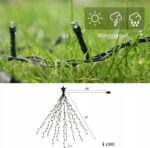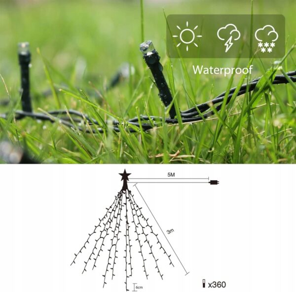 ⭐️ 3 m x 10-pasmowe lampki LED na choinkę: Przewód zasilający o długości 5 m, zasilacz 31 V, odległość między światłami 6 cm, 10 kabli w kolorze ciemnozielonym zwisających w dół, 360 diod LED, 35 diod na każdym kablu, 15 lampek na koronie drzewa o średnicy 15 cm.
