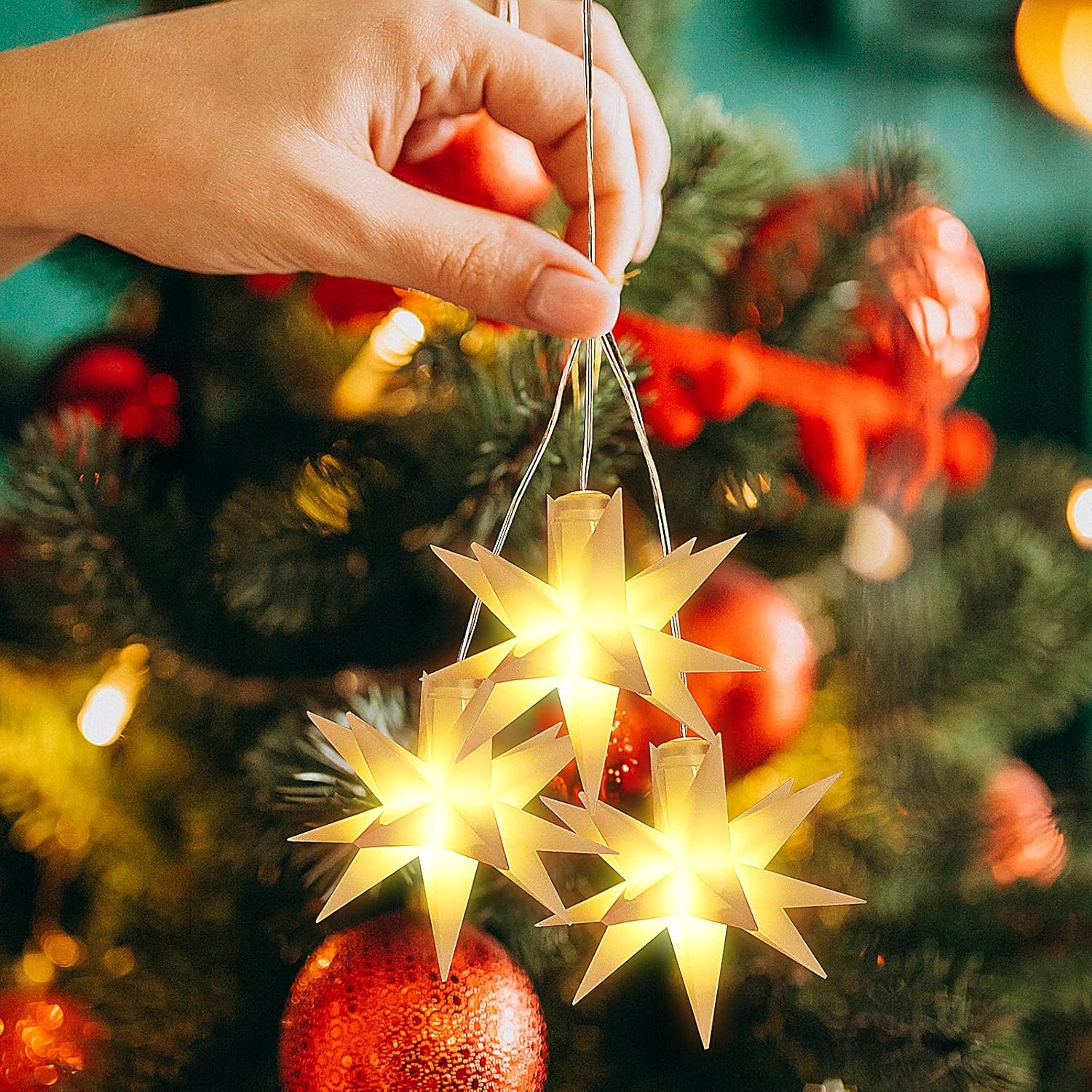 ⭐️ Świąteczne oświetlenie LED: Zestaw składa się z 3 gwiazd LED, których całkowita długość to 1,5 m (długość lampki: 1 m, przewód zasilający: 0,5 m). Odstępy między poszczególnymi gwiazdami wynoszą: 20 cm, 30 cm i 1 m.