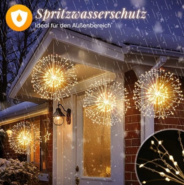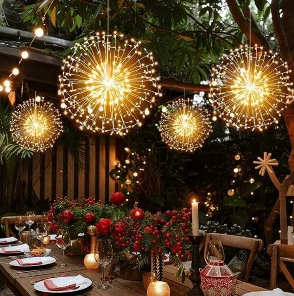 Dekoracyjna kula świetlna tworząca efekt rozbłysku fajerwerków. 198 ciepłych białych diod LED na elastycznych przewodach miedzianych pozwala stworzyć efektowną ozdobę do domu, ogrodu lub na przyjęcia.