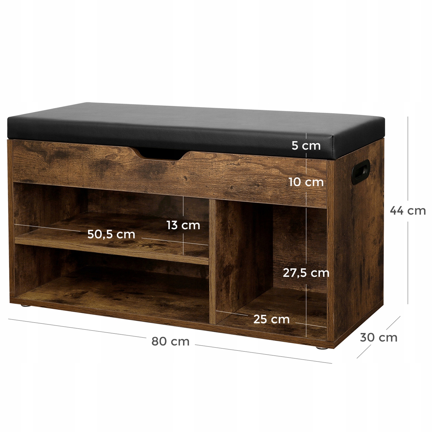 Solidna konstrukcja z płyty wiórowej wytrzymuje obciążenie do 150 kg, a miękkie siedzisko z pianką o grubości 4 cm zapewnia wygodę podczas siedzenia. Pod siedziskiem znajduje się ukryty schowek na drobne akcesoria, takie jak szczotki do butów, rękawiczki czy klucze.