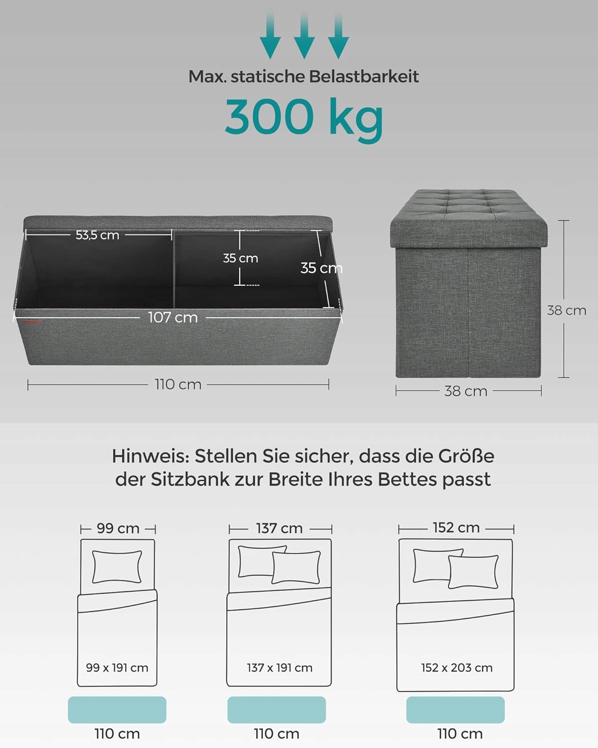 Duża pojemność 120 l pozwala schować koce, poduszki, zabawki, buty czy sezonową odzież. Elegancka tapicerka w kolorze ciemnoszarym o strukturze imitującej len sprawia, że ławka pasuje zarówno do nowoczesnych, jak i klasycznych wnętrz.
