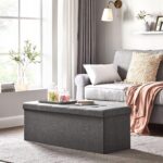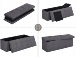 Duża pojemność 120 l pozwala schować koce, poduszki, zabawki, buty czy sezonową odzież. Elegancka tapicerka w kolorze ciemnoszarym o strukturze imitującej len sprawia, że ławka pasuje zarówno do nowoczesnych, jak i klasycznych wnętrz.