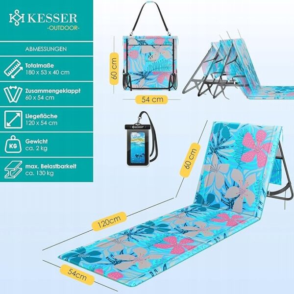 KESSER® Składany leżak plażowy z regulowanym oparciem | 130 kg | Lekki i kompaktowy | Wodoodporna torba | Niebieski