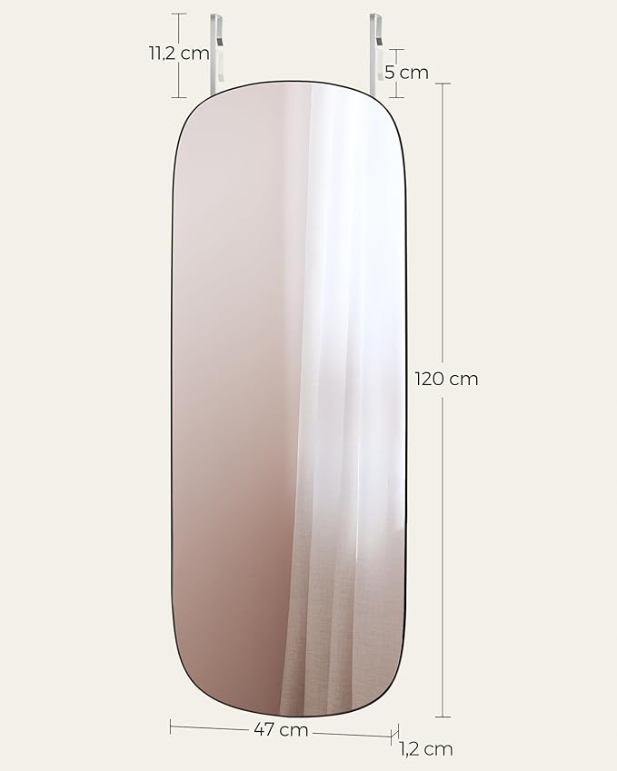 Nowoczesne lustro ścienne lub na drzwi SONGMICS to połączenie elegancji funkcjonalności i bezpieczeństwa. Minimalistyczny łukowy kształt nadaje wnętrzu stylu i optycznie je powiększa.