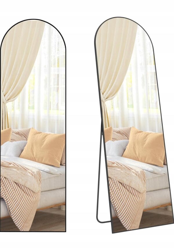 Eleganckie lustro stojące SONGMICS o wymiarach 160 × 50 cm pozwala zobaczyć całą sylwetkę i idealnie dopasować stylizację. Dzięki smukłej, łukowej ramie w kolorze czarnym lustro pełni nie tylko funkcję praktyczną, ale także dekoracyjną, dodając wnętrzu nowoczesnego charakteru.