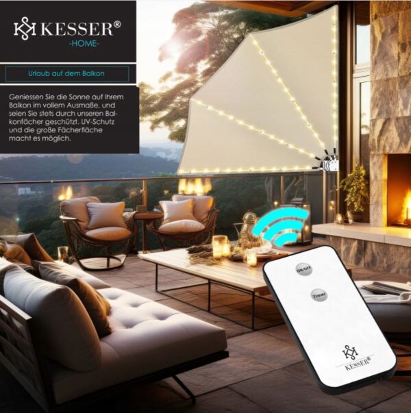 Balkonowa markiza KESSER z oświetleniem LED – idealna ochrona przed słońcem i wzrokiem sąsiadów.
