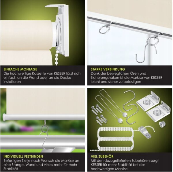 Markiza balkonowa KESSER to praktyczne i estetyczne rozwiązanie dla osób, które cenią sobie prywatność i skuteczną ochronę przed słońcem. Doskonale sprawdzi się na balkonie, tarasie, w ogrodzie, ogrodzie zimowym czy przy oknie – zarówno w domu, jak i biurze.