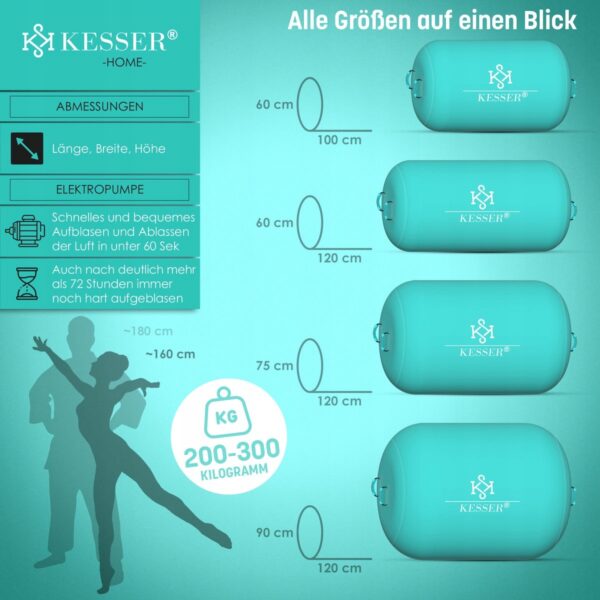 KESSER Airrolle to wysokiej jakości nadmuchiwana mata treningowa typu Air Roll, idealna do gimnastyki, jogi, pilatesu, kickboxingu oraz ćwiczeń relaksacyjnych. Dzięki solidnej konstrukcji i bogatemu wyposażeniu, sprawdzi się zarówno w domu, na siłowni, jak i w plenerze.
