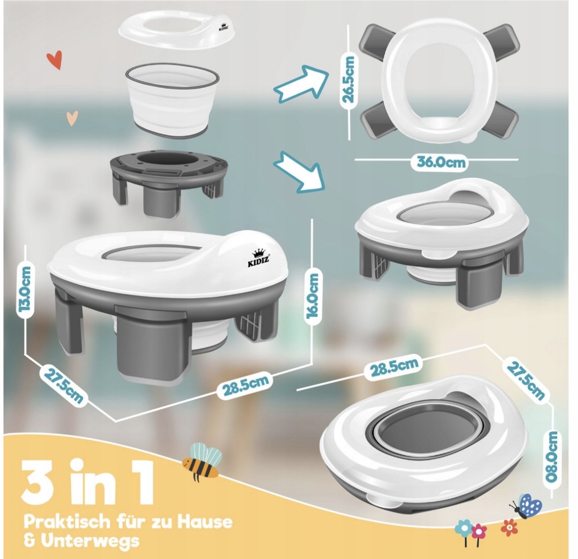 Innowacyjny i higieniczny design Dzięki innowacyjnej konstrukcji nocnik KIDIZ skutecznie chroni przed rozpryskami, dzięki czemu wszystko pozostaje czyste i suche. Nic już nie stanie na przeszkodzie podczas wakacji czy wizyty u znajomych! Ten elastyczny pomocnik przyciąga również wzrok swoim wyglądem.