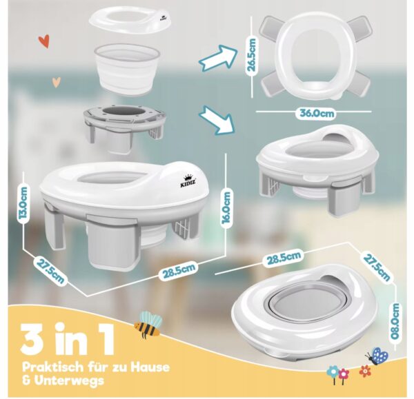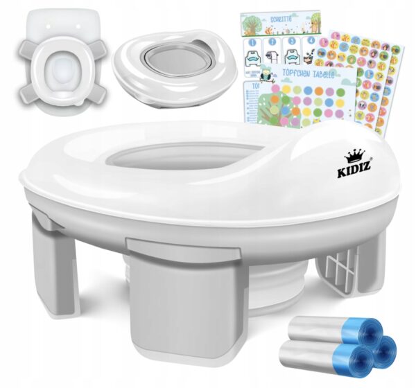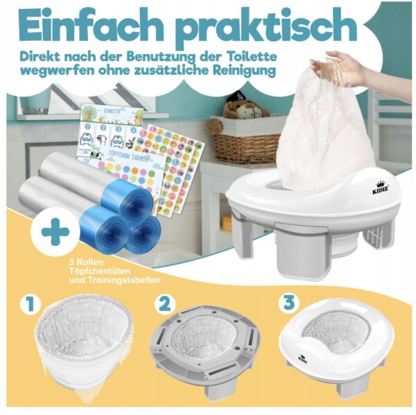✅ Wszechstronny towarzysz 3 w 1 Nocnik dla dzieci z funkcją 3 w 1 to doskonały towarzysz dla rodziców pragnących prostego i motywującego treningu czystości. Niezależnie od tego, czy jesteście w domu, czy w podróży, nasz trenażer toaletowy jest idealnym rozwiązaniem dla małych odkrywców. Dzięki dołączonym woreczkom na nieczystości, możesz go elastycznie używać w dowolnym miejscu.