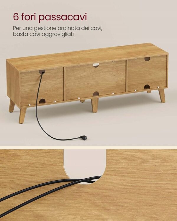 Nowoczesny stolik RTV VASAGLE łączy elegancki design, praktyczność i porządek w Twoim salonie lub sypialni. Ukośnie ustawione nogi i styl transizjonalny dodają wnętrzu lekkości i klasy, a solidna powierzchnia pomieści telewizor do 65 cali. Regulowana półka, szafki boczne i otwarte przegrody pozwalają wygodnie przechowywać sprzęt multimedialny, książki czy dekoracje, a przemyślane detale ułatwiają utrzymanie porządku i estetyki.