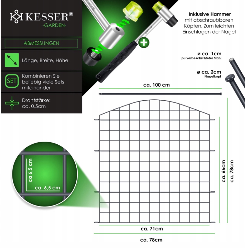 - • Wysokiej jakości zestaw składający się z elementów ogrodzenia, prętów mocujących i młotka