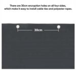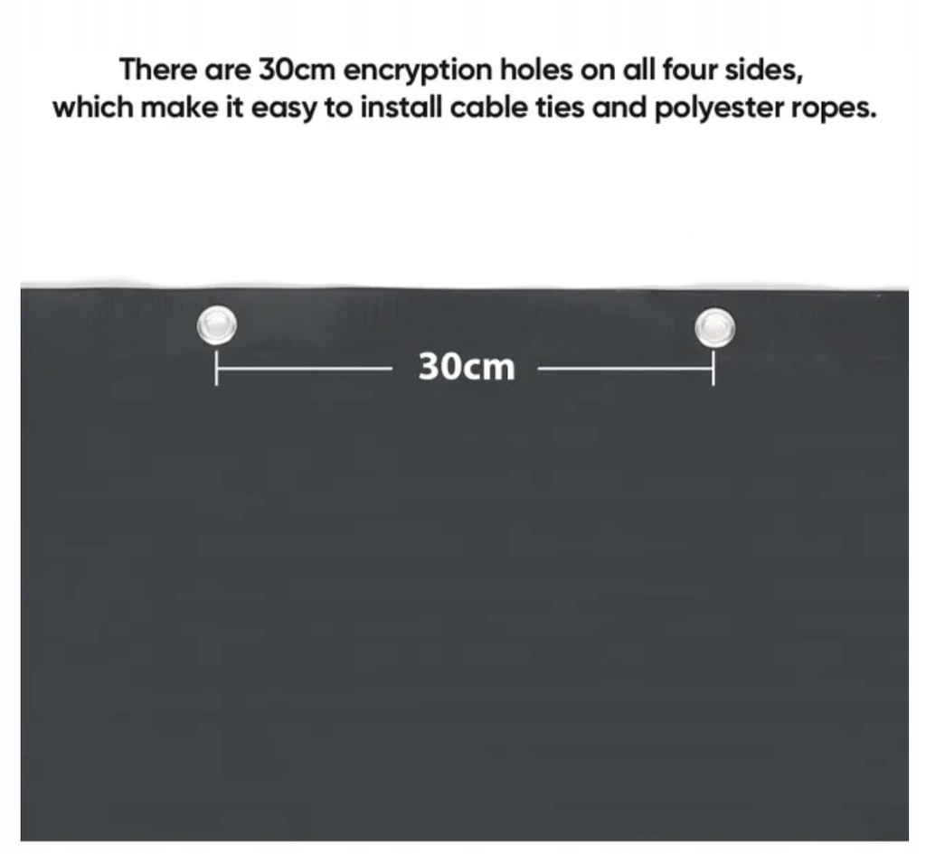 Nieprzezroczyste: Otwory na opaski kablowe/linę są umieszczone co 30 cm, co utrudnia atak przez wiatr. Produkt jest dostarczany z opaskami kablowymi. Zaleca się stosowanie liny poliestrowej z opaskami kablowymi. To bezpiecznie mocuje produkt.