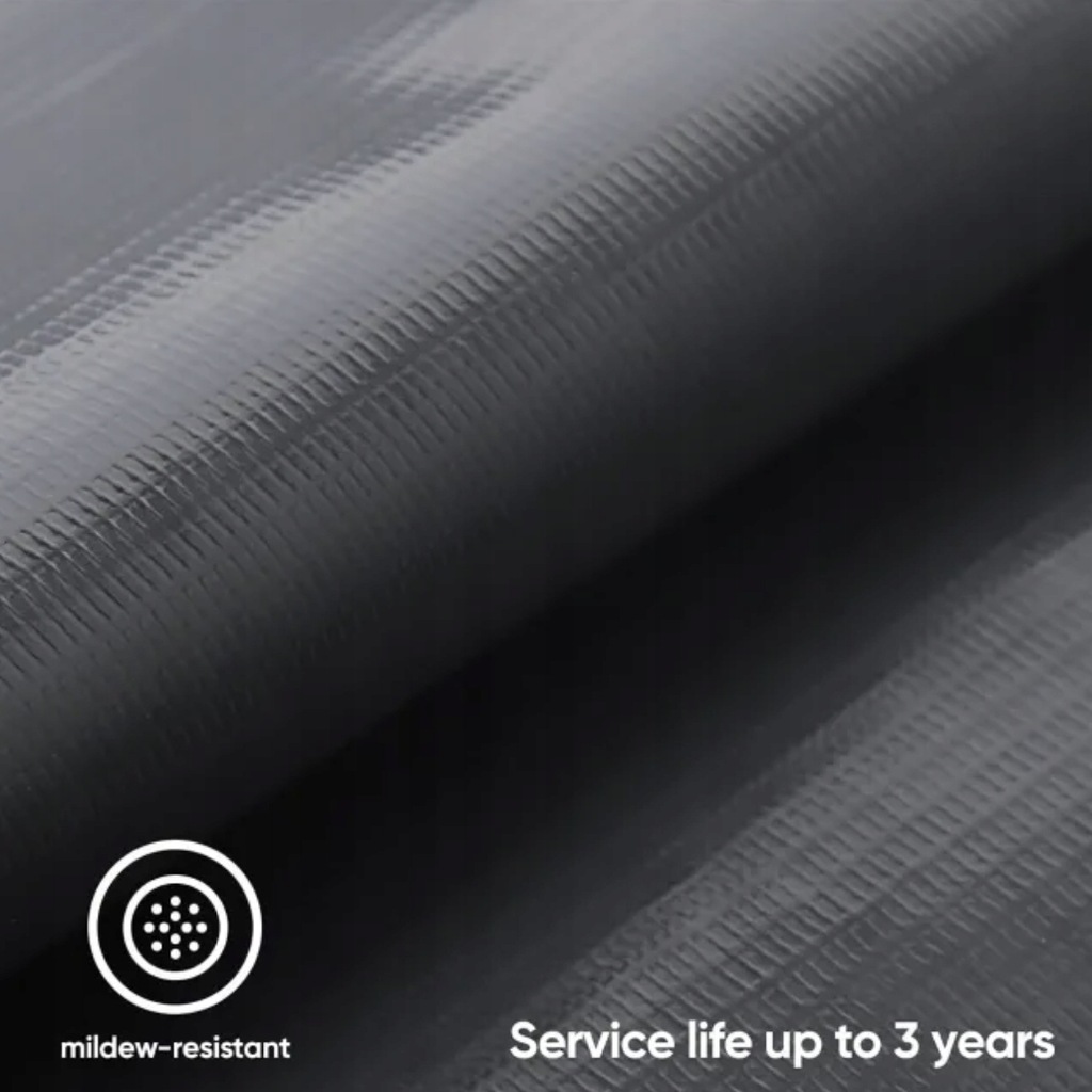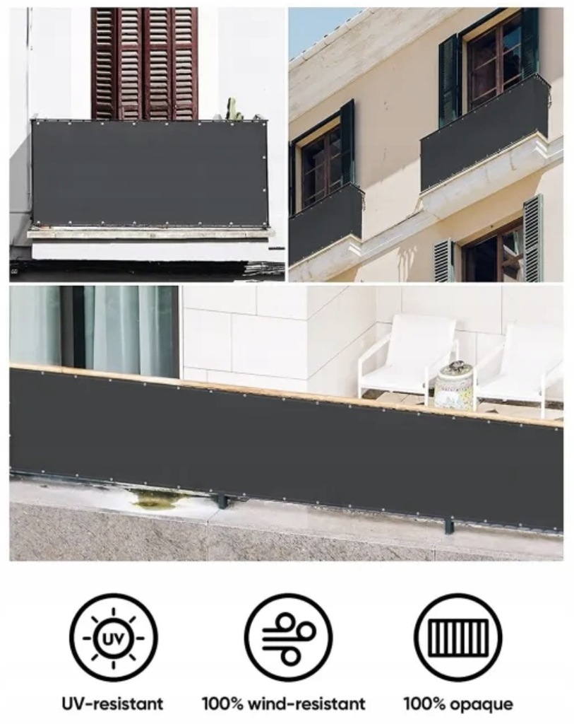 Odporność na pękanie, promieniowanie UV i pleśń: Tkanina balkonowa jest odporna na naturalny proces blaknięcia, a tym samym gwarantuje dłuższą żywotność. Otwory są wykonane z aluminium i dlatego nie są rdzy. Materiał jest twardy i w 100% odporny na wiatr i pleśń. Trwałość do 3 lat.