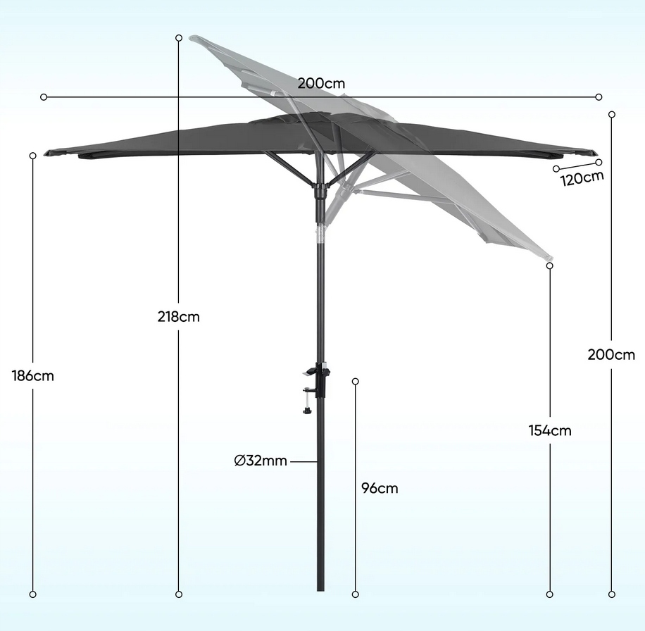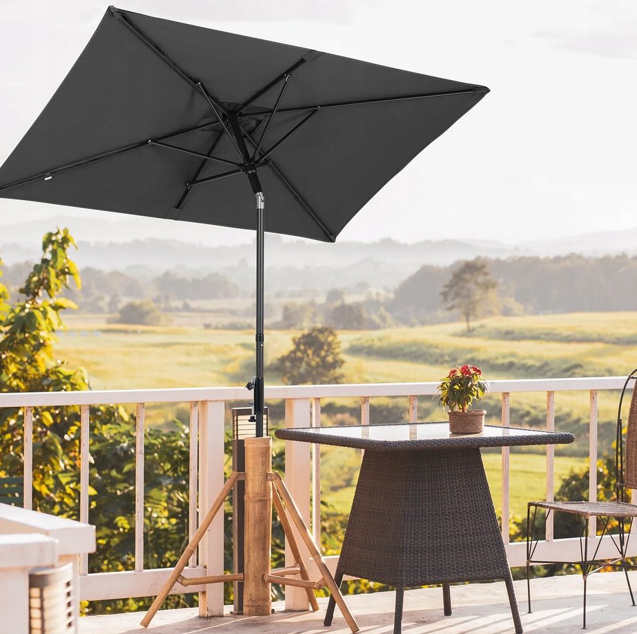 Funkcjonalny parasol balkonowy o prostokątnym kształcie 200 x 125 cm zapewnia dużą powierzchnię cienia i skuteczną ochronę przed promieniowaniem UV50+. Idealny na balkon, taras czy do ogrodu – szczególnie tam, gdzie liczy się oszczędność miejsca.