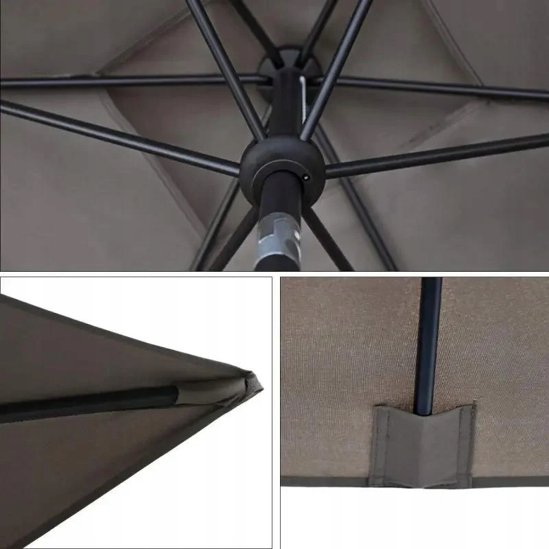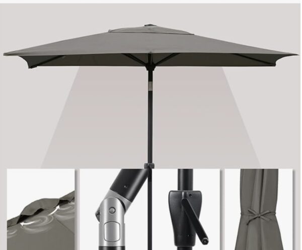 Dzięki wygodnej korbce parasol można łatwo rozkładać i składać, a regulacja kąta nachylenia pozwala dopasować ustawienie do położenia słońca przez cały dzień.