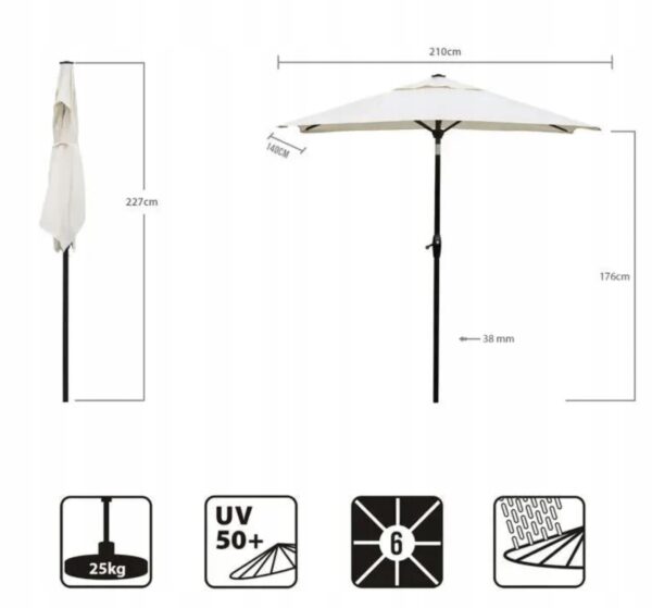 Lekka, a jednocześnie wytrzymała aluminiowa konstrukcja gwarantuje odporność na korozję i długą żywotność. Materiał z filtrem UV50+ skutecznie chroni przed słońcem, a otwór wentylacyjny zwiększa stabilność podczas wiatru.