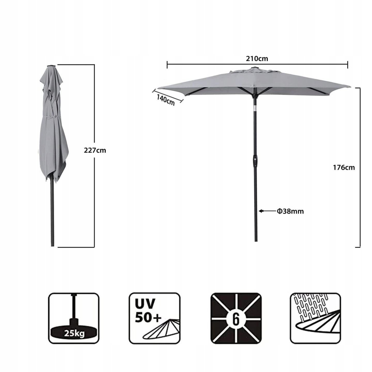 Lekka, a jednocześnie wytrzymała aluminiowa konstrukcja gwarantuje odporność na korozję i długą żywotność. Materiał z filtrem UV50+ skutecznie chroni przed słońcem, a otwór wentylacyjny zwiększa stabilność podczas wiatru.