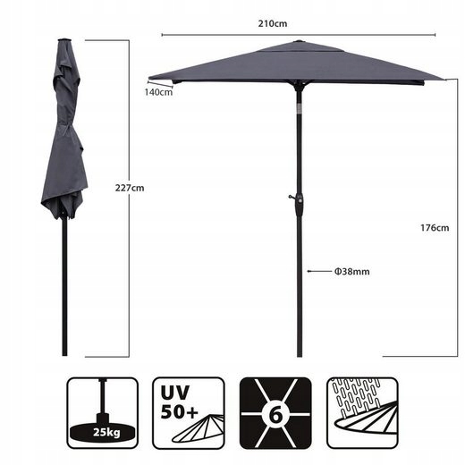 Nowoczesny parasol balkonowy o wymiarach 210 x 140 cm to idealne rozwiązanie na taras, balkon lub do ogrodu. Duża powierzchnia zapewnia komfortowy cień, a elegancki kolor szary doskonale komponuje się z każdą przestrzenią.