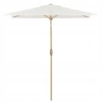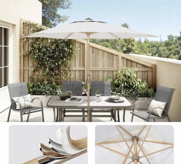 Stabilna konstrukcja z aluminium i metalu gwarantuje trwałość oraz odporność na korozję. Maszt wykończony powłoką imitującą drewno nadaje parasolowi stylowy, naturalny wygląd, zachowując jednocześnie wytrzymałość metalu.