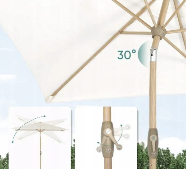 Parasol wyposażony jest w wygodny mechanizm korbowy, który umożliwia szybkie i łatwe rozkładanie. Regulacja kąta nachylenia pozwala dopasować ustawienie do słońca przez cały dzień, a otwór wentylacyjny zwiększa stabilność przy wietrznej pogodzie.