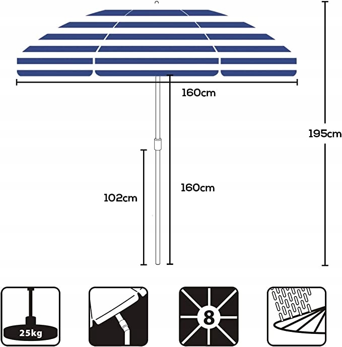 Praktyczny i lekki parasol plażowy o średnicy 160 cm zapewnia skuteczną ochronę przed słońcem dzięki filtrowi UV25+. Idealny na plażę, balkon, do ogrodu czy parku. Dzięki niewielkiej wadze oraz dołączonej torbie z paskiem jest wygodny do przenoszenia i transportu.
