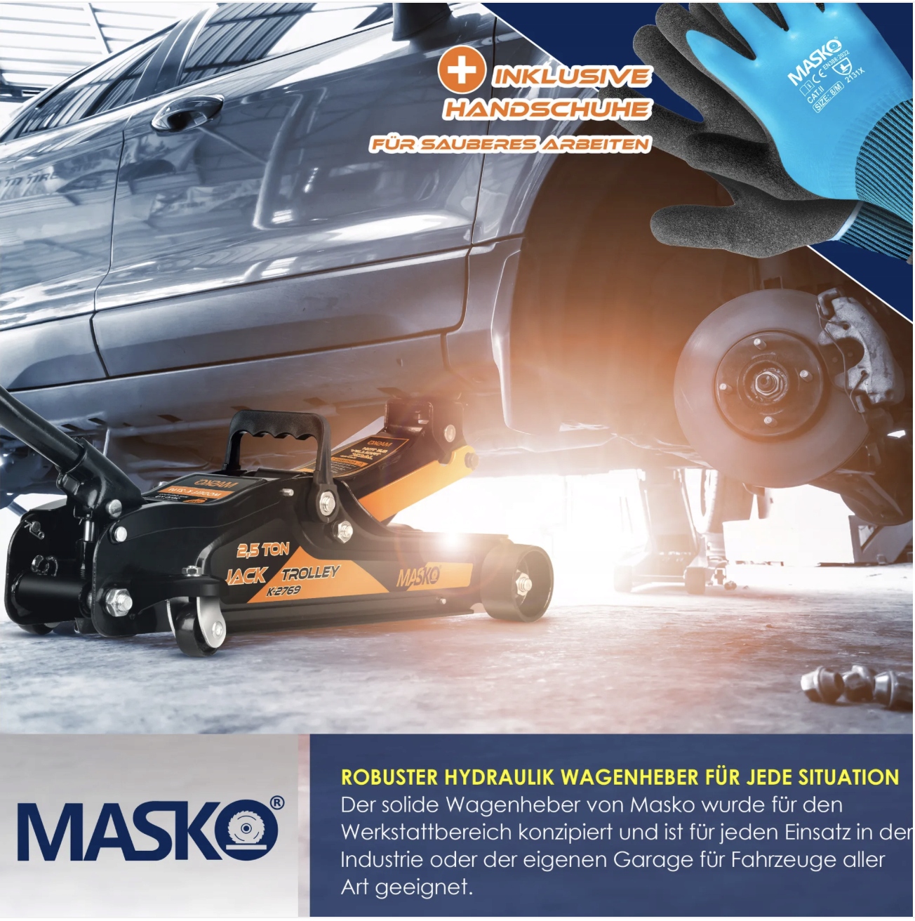 MASKO® Podnośnik samochodowy hydrauliczny z 360° kółkami + 2 gumowe nakładki + rękawice robocze