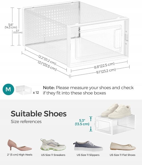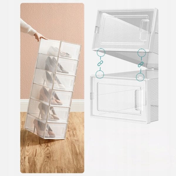 Zorganizuj swoją kolekcję obuwia dzięki zestawowi 12 praktycznych pudełek na buty SONGMICS. Transparentne ścianki oraz przednie drzwiczki pozwalają szybko znaleźć odpowiednią parę bez konieczności otwierania każdego pudełka.