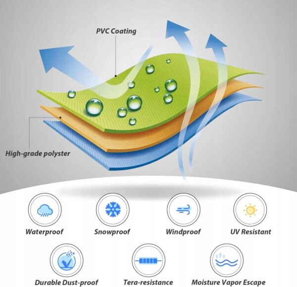 Wodoodporny i trwały materiał: pokrowiec wykonany jest z materiału 210D Oxford, wodoodporna tkanina jest pokryta PVC i zastosowano podwójne szwy. Ten rodzaj tkaniny jest bardzo elastyczny i bardzo trwały, może chronić twoje meble przed światłem słonecznym, wiatrem, deszczem, śniegiem i innymi, jest wodoodporny i odporny na rozdarcia.