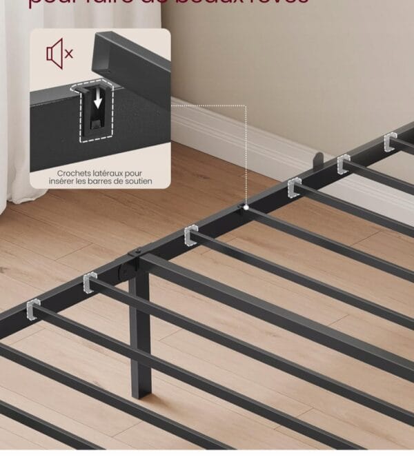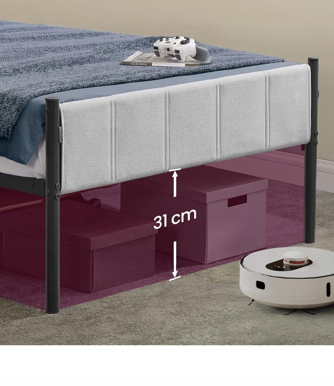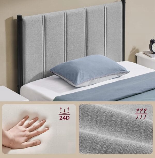 Tapicerowany zagłówek z miękką pianką zapewnia wygodne oparcie podczas czytania lub oglądania TV. Stabilna stalowa konstrukcja z 9 nogami gwarantuje wytrzymałość i spokojny sen bez skrzypienia.