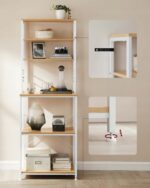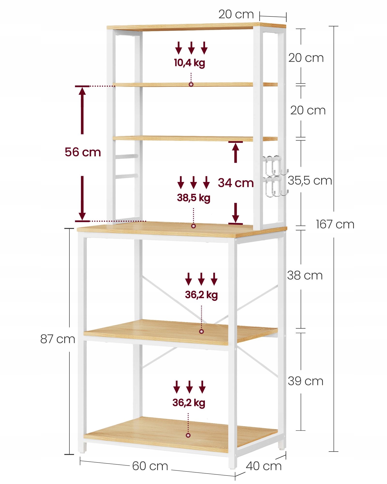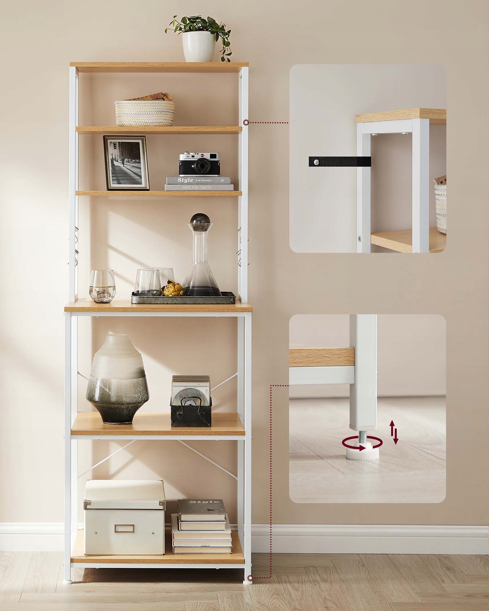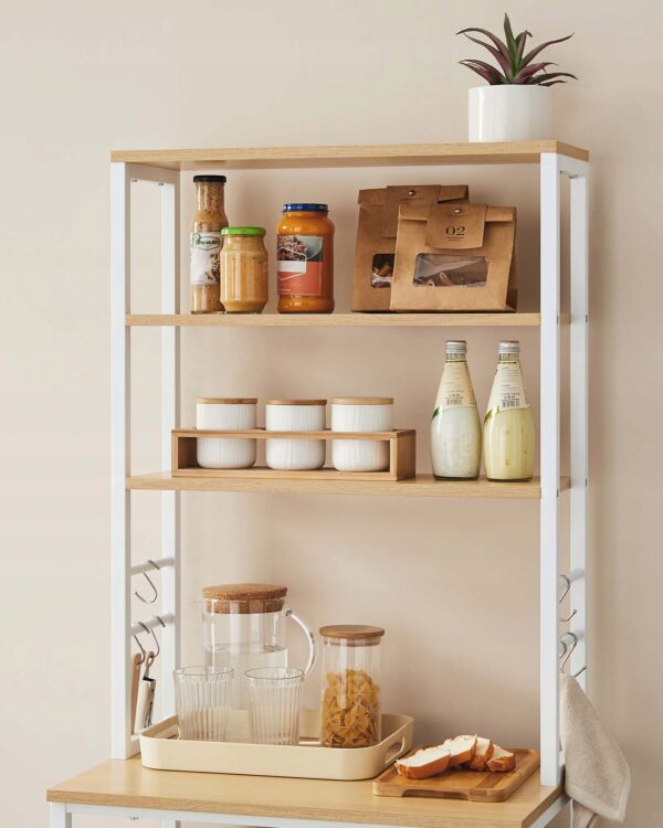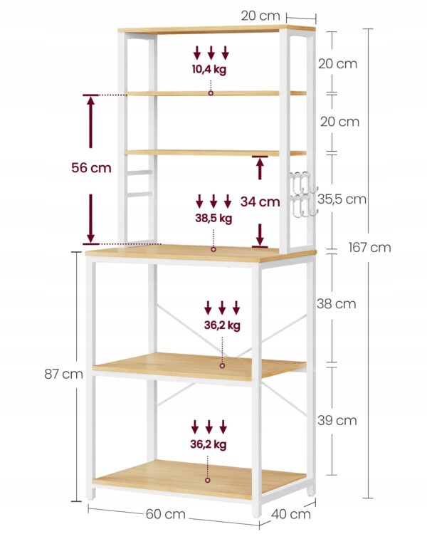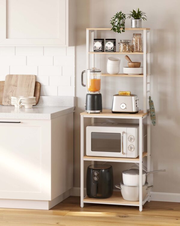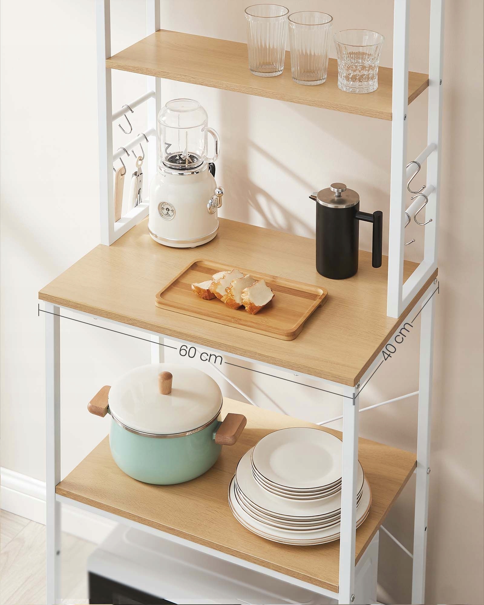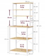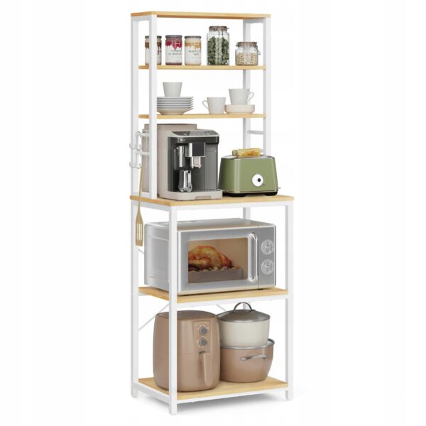 Funkcjonalny regał kuchenny w kolorze złoty dąb i biel chmur to idealne rozwiązanie do mniejszych przestrzeni. 6 poziomów i dodatkowe haczyki pozwalają wygodnie zorganizować mikrofalę, ekspres do kawy, blender oraz akcesoria kuchenne.