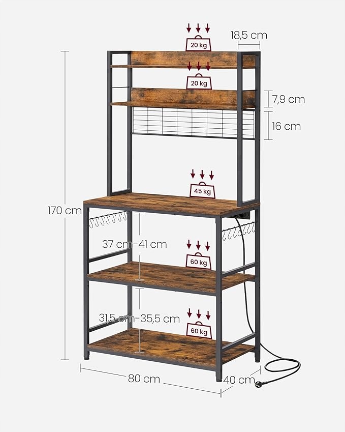 Regał kuchenny z gniazdkami półka na mikrofalę 170 cm VASAGLE