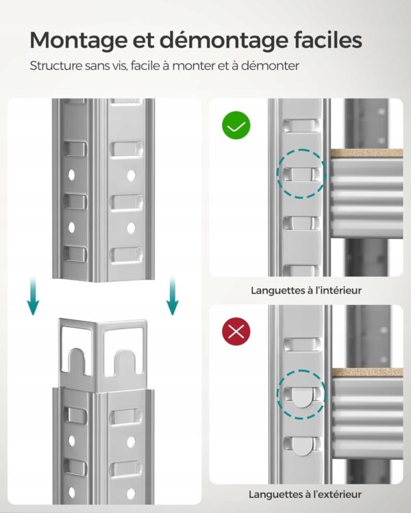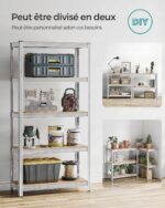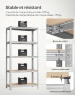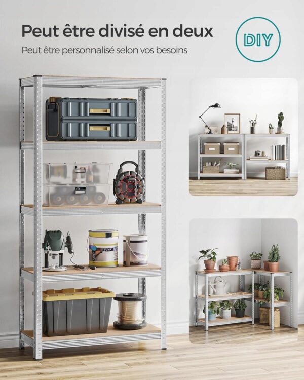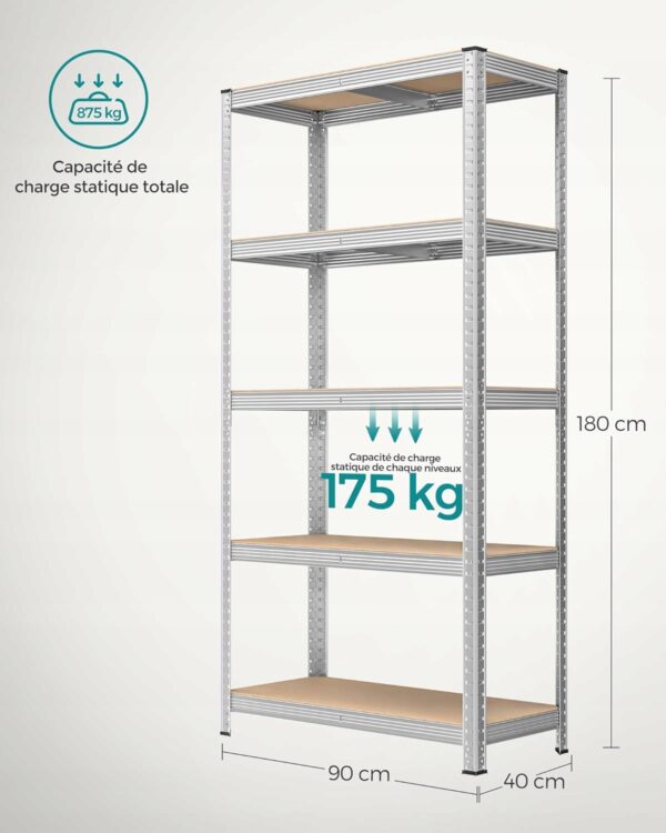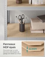 Solidny regał magazynowy SONGMICS to idealne rozwiązanie do przechowywania ciężkich przedmiotów w garażu, magazynie, kuchni czy biurze. Dzięki wytrzymałej stalowej konstrukcji i mocnym półkom z MDF zapewnia wysoką nośność oraz stabilność.