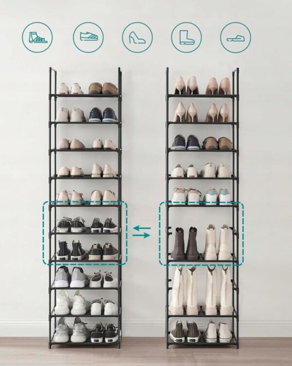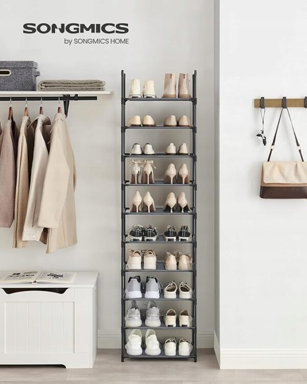 Masz dość bałaganu w butach? Ten wąski regał na buty SONGMICS pomoże Ci uporządkować przestrzeń w prosty i wygodny sposób. Dzięki 10 poziomom z łatwością pomieści obuwie całej rodziny, nie zajmując przy tym dużo miejsca.