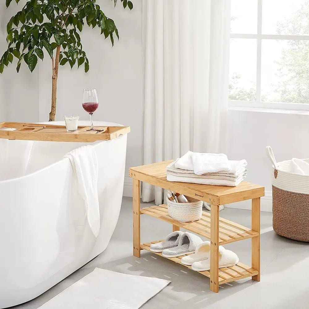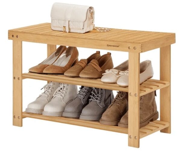 Praktyczny regał na buty z funkcją ławki to idealne rozwiązanie do przedpokoju lub garderoby. Wykonany z naturalnego bambusa, łączy trwałość z estetycznym wyglądem, pasując do różnych aranżacji wnętrz.