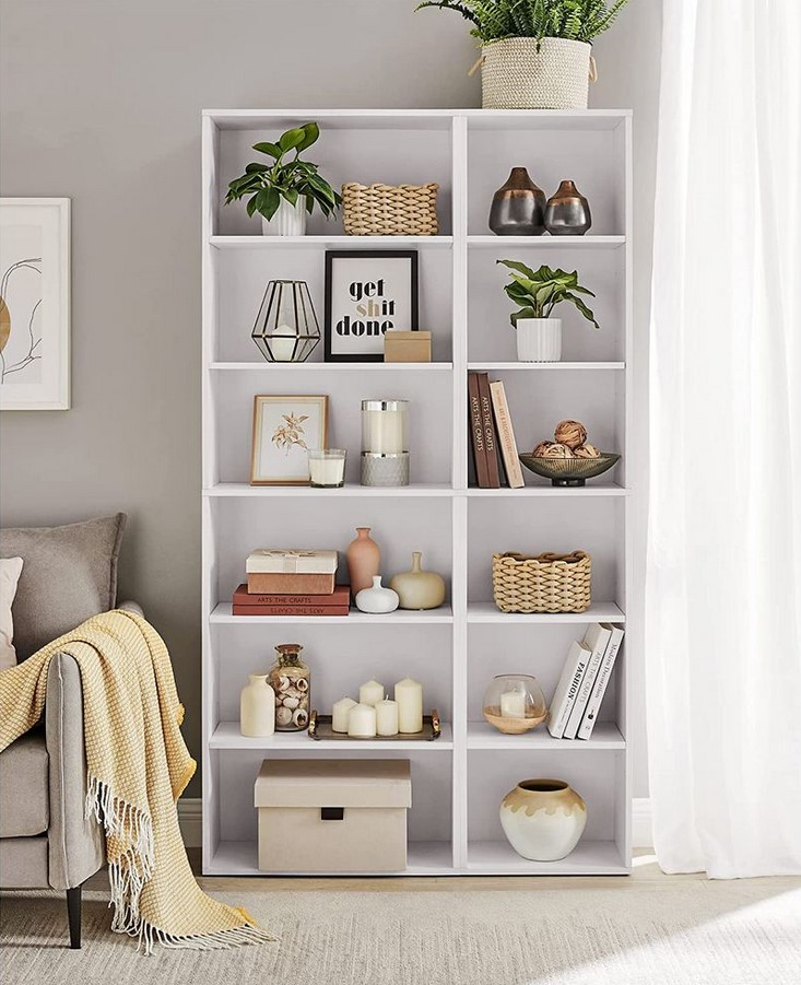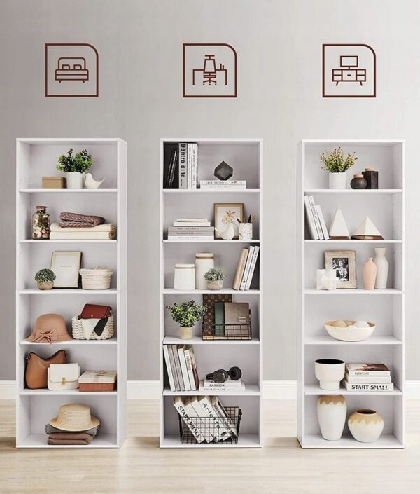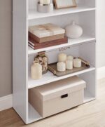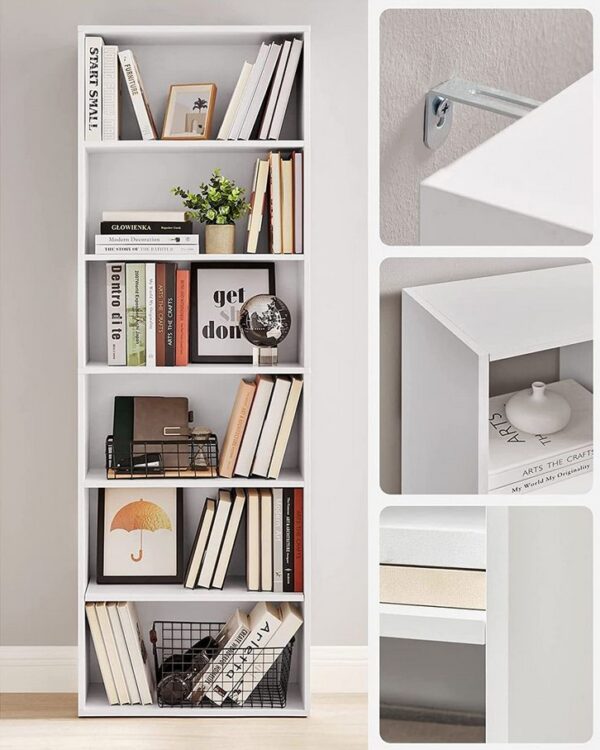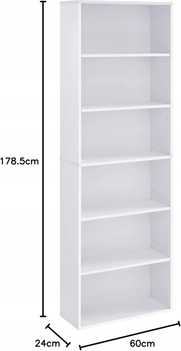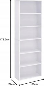Wąska konstrukcja pozwala maksymalnie wykorzystać przestrzeń pionową, co czyni go idealnym rozwiązaniem do mniejszych pomieszczeń. 6 pojemnych półek zapewnia dużo miejsca na książki, dekoracje czy rośliny.