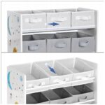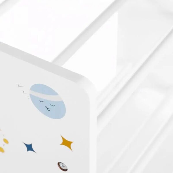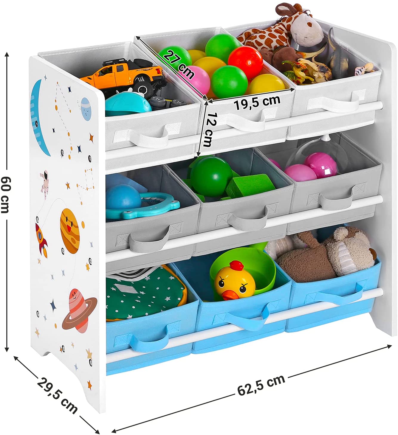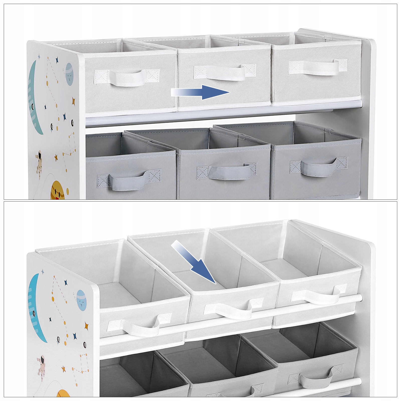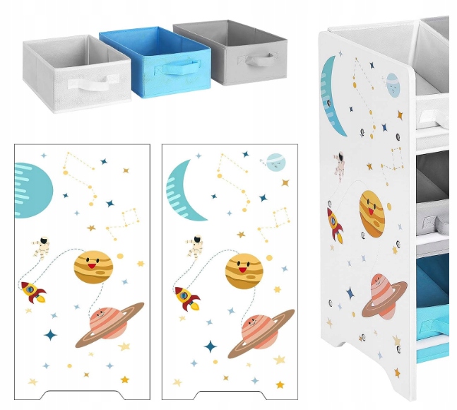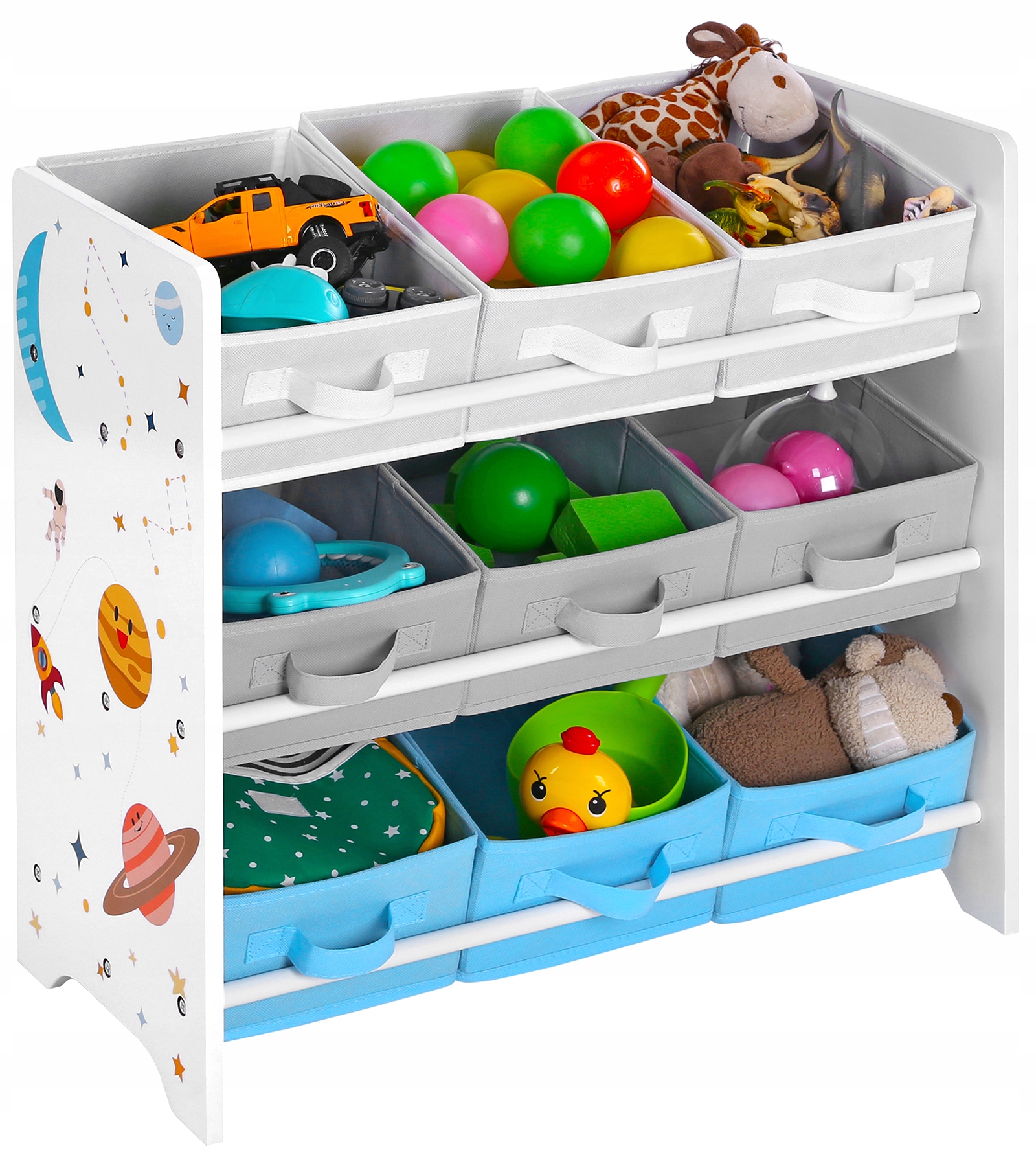 Praktyczny regał dziecięcy na zabawki i książki pomoże utrzymać porządek w pokoju malucha. 9 wyjmowanych pojemników ułatwia segregację, a kosmiczny motyw zachęca dzieci do samodzielnego sprzątania.