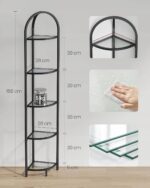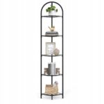 Stylowy sposób na wykorzystanie pustego narożnika. Nowoczesny regał VASAGLE z półkami ze szkła hartowanego i stalową ramą w kolorze klasycznej czerni doskonale wyeksponuje książki, rośliny, dekoracje lub kosmetyki.