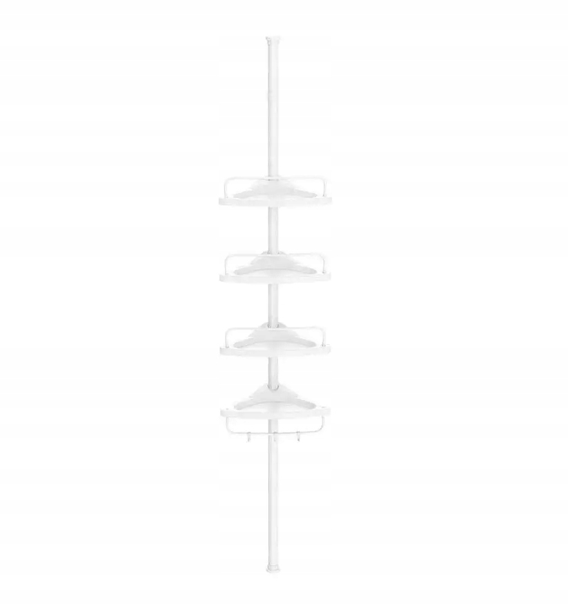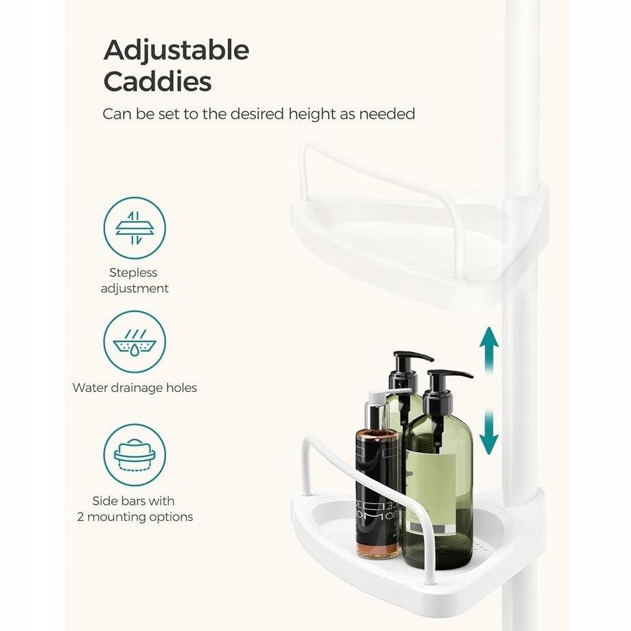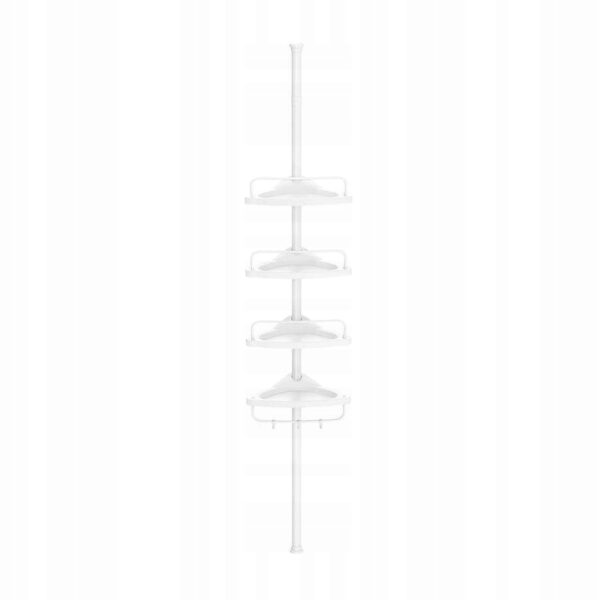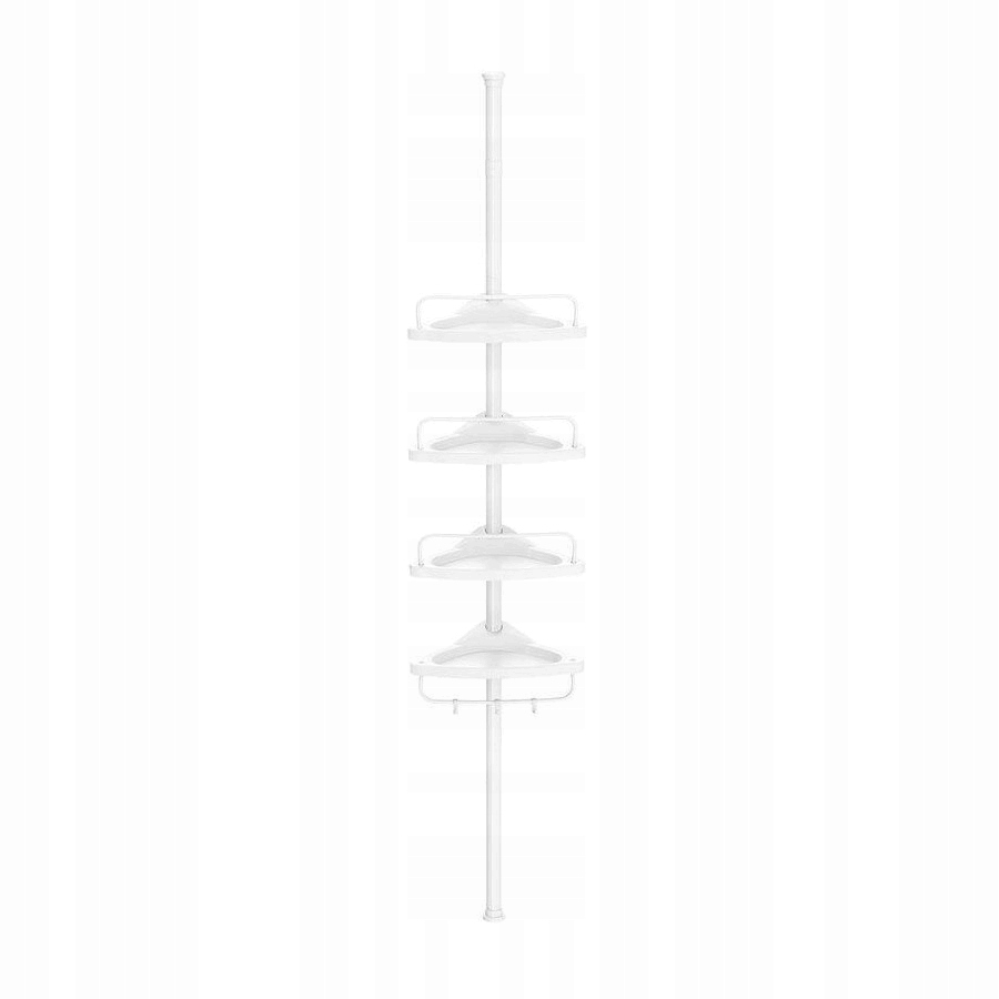 Cztery przestronne półki i trzy haczyki pozwalają uporządkować szampony, żele, myjki czy gąbki. Otwory odpływowe zapobiegają gromadzeniu się wody, a boczne drążki można ustawić w dwóch pozycjach, zwiększając funkcjonalność.