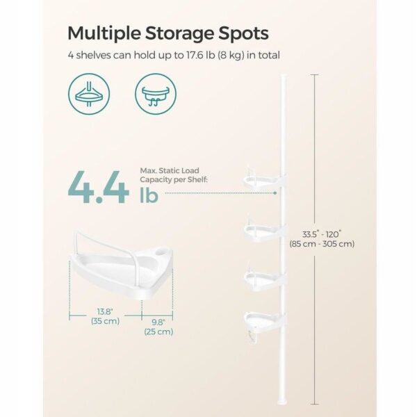 Praktyczna i funkcjonalna półka pod prysznic SONGMICS zapewnia dodatkowe miejsce do przechowywania wszystkich niezbędnych akcesoriów łazienkowych. Dzięki teleskopowej konstrukcji i regulowanej wysokości od 85 do 305 cm idealnie dopasujesz ją do każdego pomieszczenia.