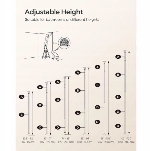 ✅ Regulowana wysokość 85–305 cm – dopasowanie do każdego prysznica