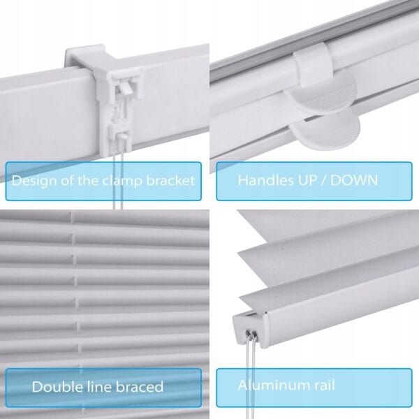 Roleta montowana jest za pomocą czterech regulowanych uchwytów zaciskowych dołączonych do zestawu. Instalacja jest szybka i prosta bez użycia narzędzi bez śrub i bez uszkadzania okna.