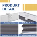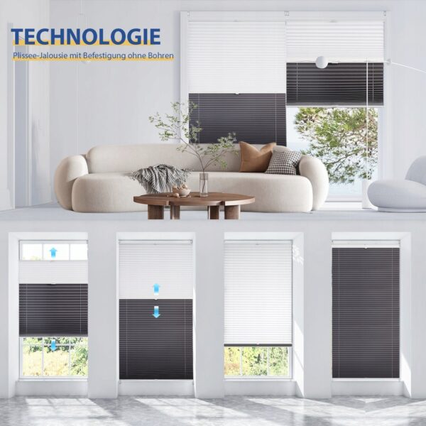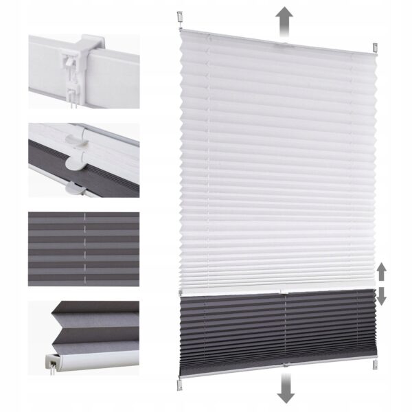 ✅ Elastyczna obsługa: za pomocą aluminiowego pręta można łatwo dopasować plisy dla zmiennej przepuszczalności światła – w kolorze białym ze wzorem lub szarym, całkowicie nieprzepuszczające światła.