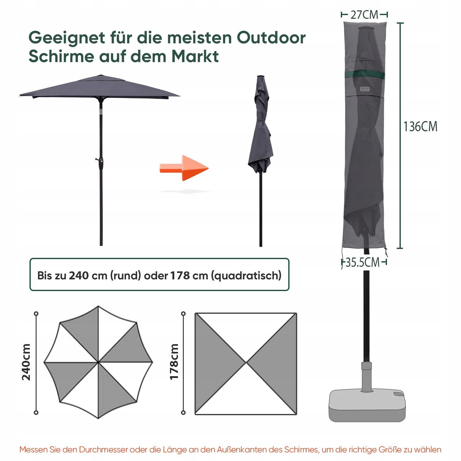 ✅ Wskazówka: Jak należy rozumieć wymiary. Na przykład 136 cm x 27/35,5 cm: 136 cm oznacza długość pokrowca ochronnego. 27 cm i 25,5 cm oznacza szerokość etui na górze i na dole (nie średnica).