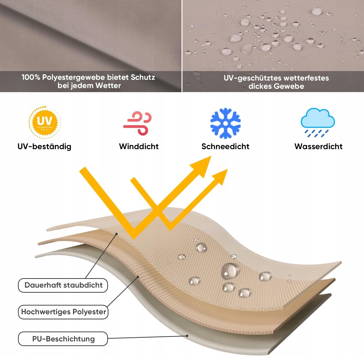 ✅ Wytrzymały materiał: tkanina Oxford 600D, około 300 g/m². Tkanina jest pokryta dodatkową powłoką odporną na promieniowanie UV, odporna na rozerwanie i posiada wodoodporną, laminowaną tylną stronę. Dzięki temu Twój parasol przeciwsłoneczny jest optymalnie chroniony przy każdej pogodzie