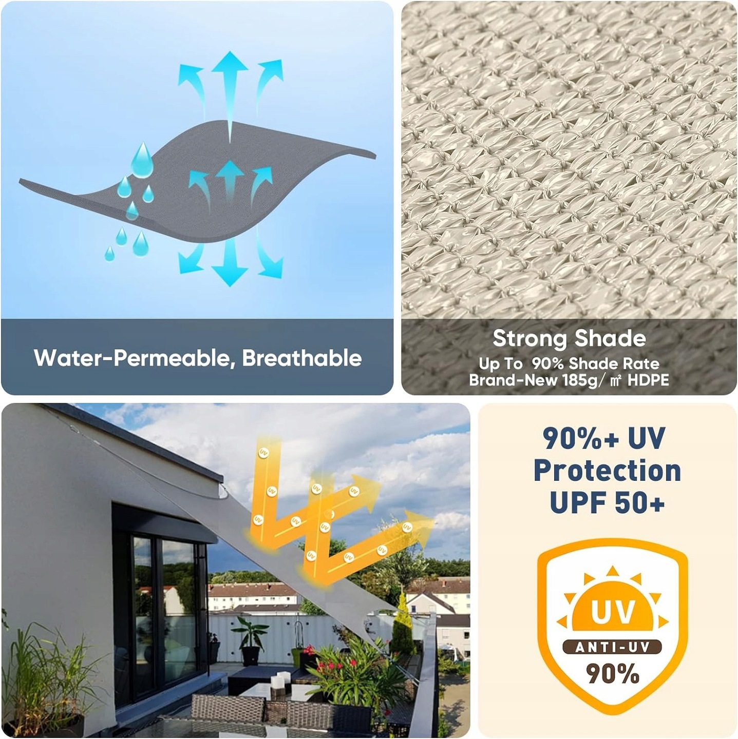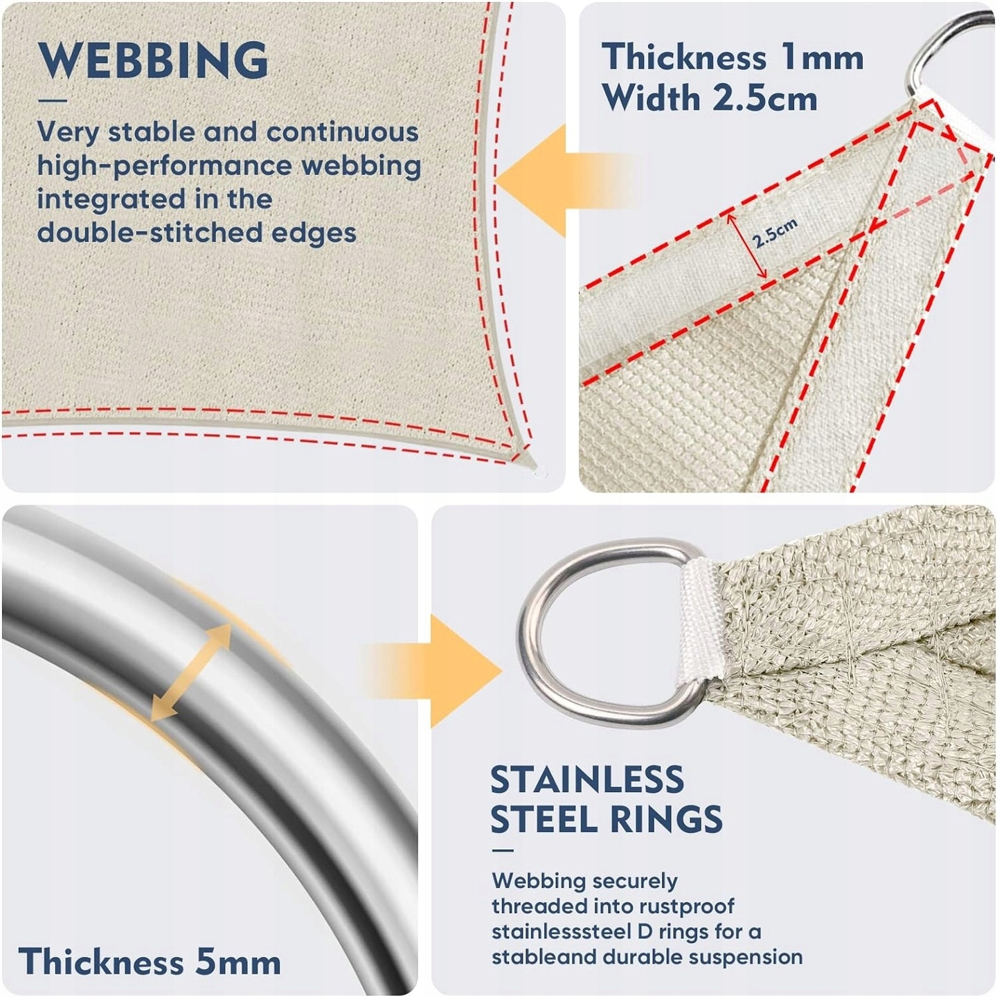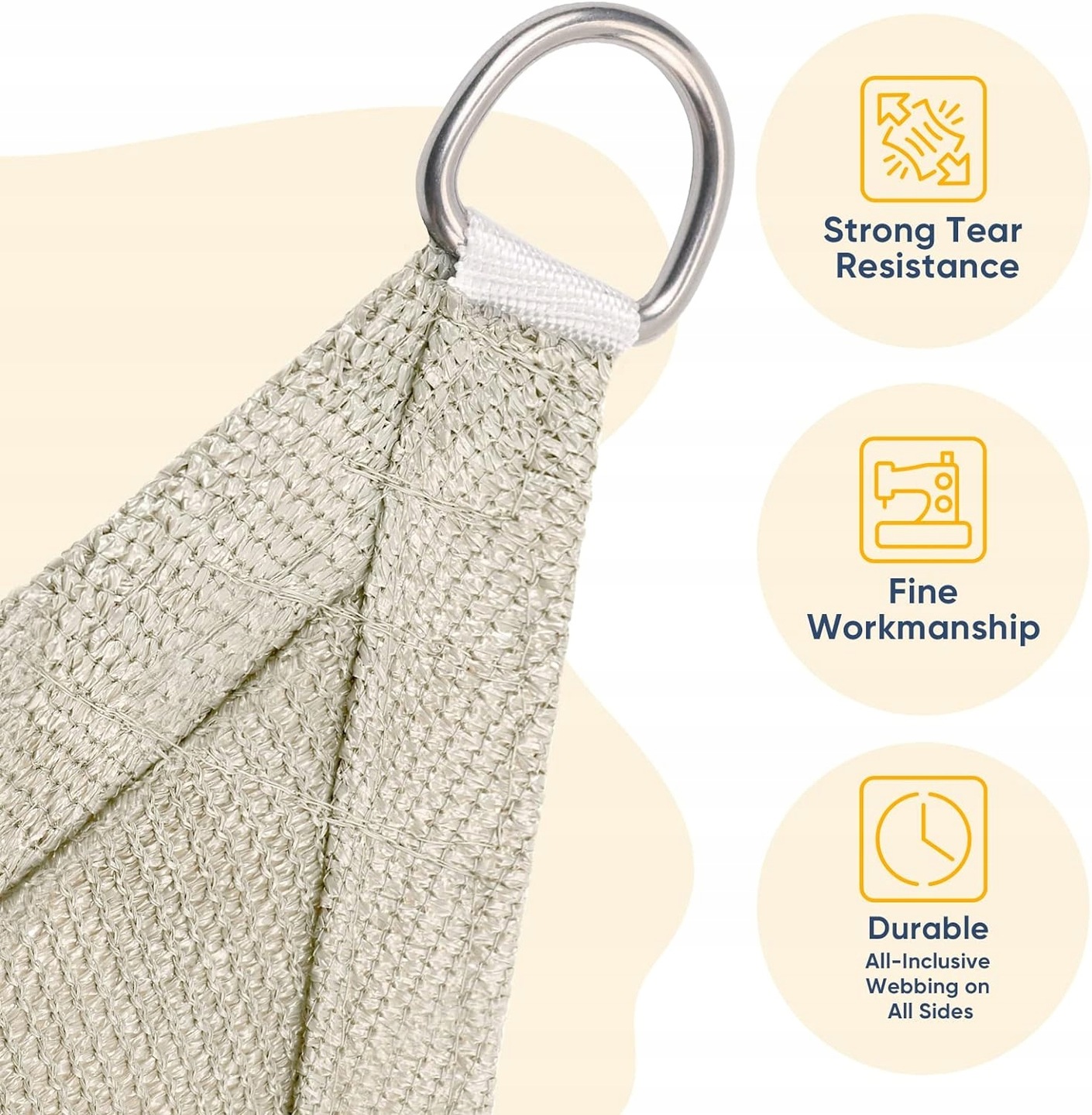 Sekey Prostokątny żagiel przeciwsłoneczny 3,6 x 3,6 x 3,6 m HDPE Przepuszczalna ochrona UV Trwała i oddychająca na patio, ogród, patio, z liną, beżowy