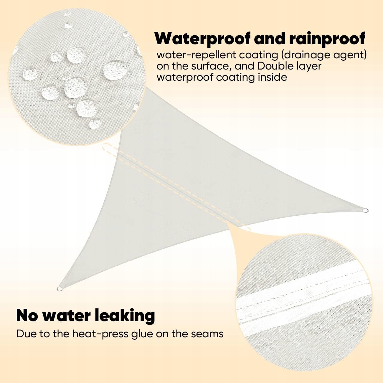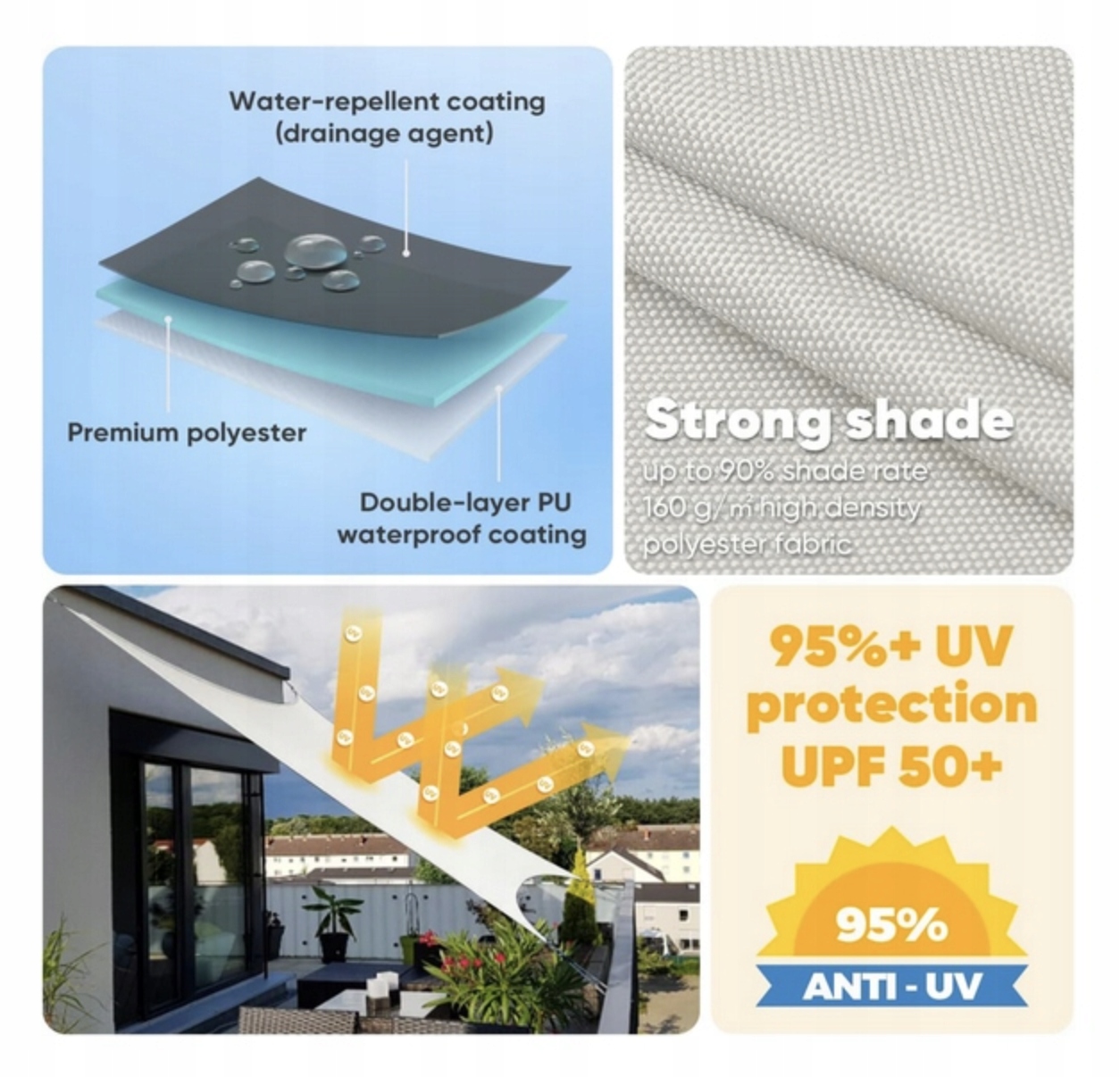 ✅ Przeciwsłoneczny żagiel w 100% wykonany z wysokiej jakości i gęstej tkaniny poliestrowej, wodoodporny materiał na powierzchni, podwójna powłoka PU wewnątrz, trwała i bezpieczna. Jest odporny na światło, wodoodporny, rozdarcia, odporny na warunki atmosferyczne i wolny od pleśni i plam.